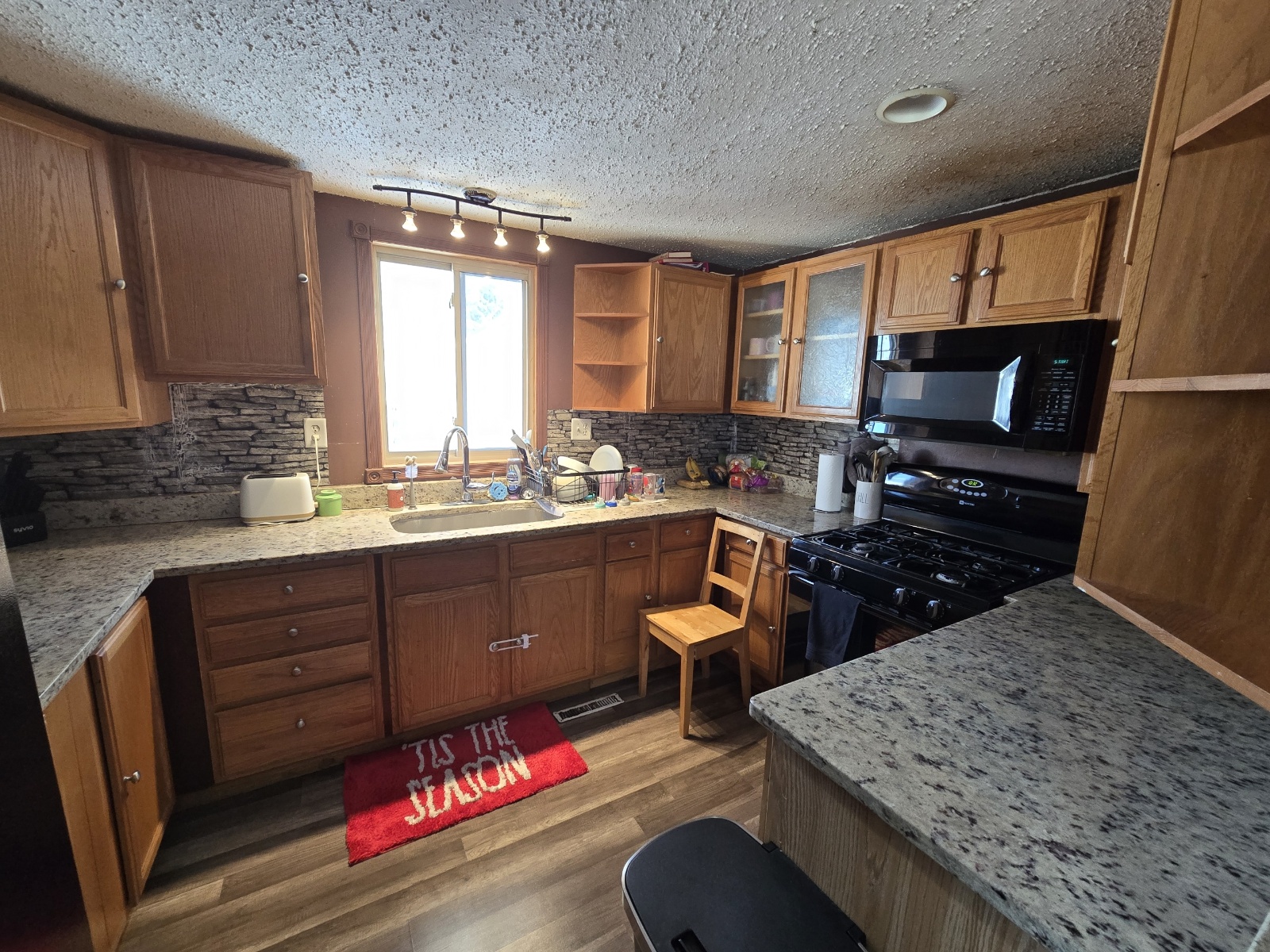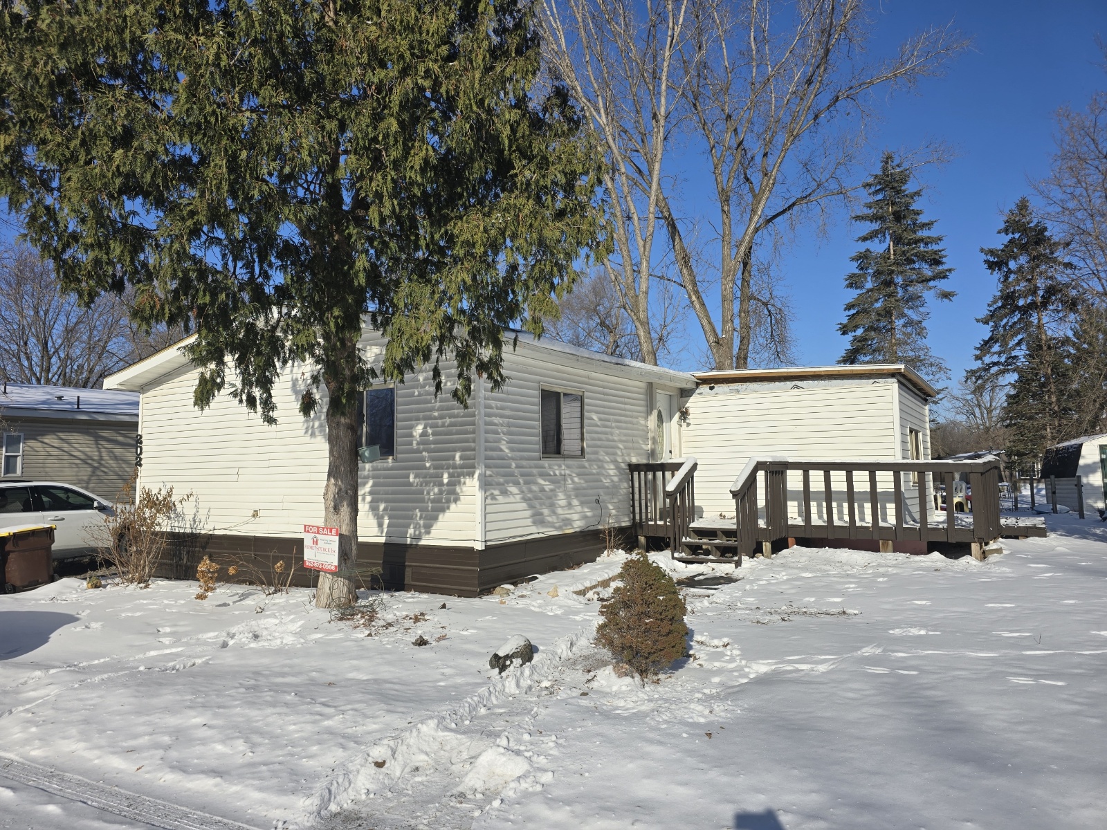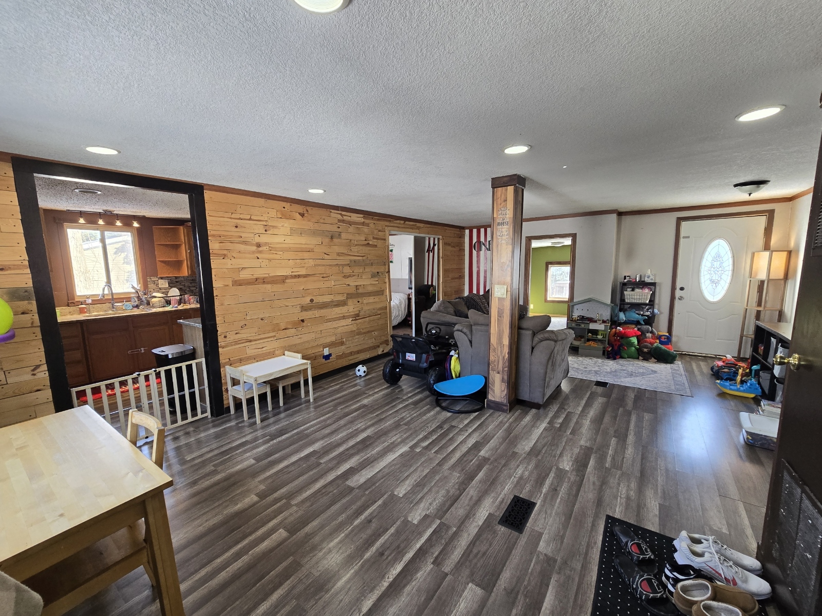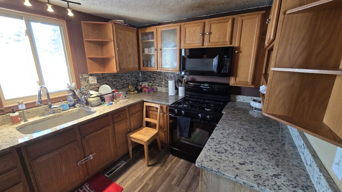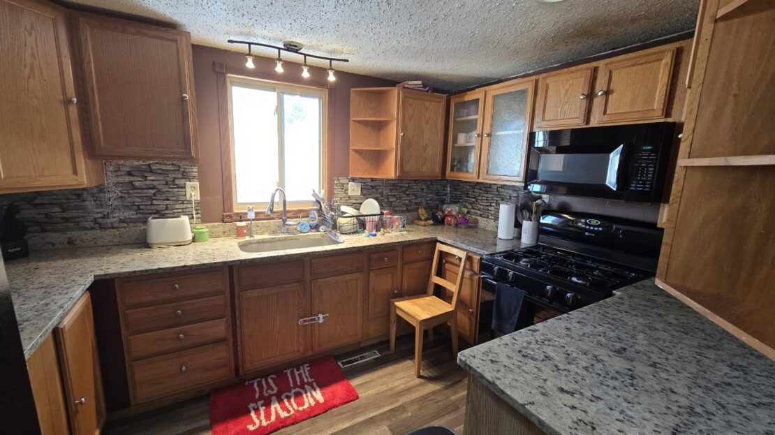 This 1978 24×44 4 bedroom 1 bathroom Moduline manufactured home is gorgeous with sheetrock throughout! The kitchen is beautiful with new cabinets, a newer stove, large side by side refrigerator with water and ice in the door, microwave, granite countertops, a farmer’s sink, tall pull down gooseneck faucet, and a window above the sink. The living room is wide open and has an amazing custom wood wall, newer front and back doors, recessed lighting, and sliding mirrored doors leading to another bedroom! The bathroom has a new vanity, sink, faucet, and a ceramic tiled shower. The laundry area is separate, has overhead cabinets, and the newer washer and dryer are also staying. It has new ceiling fans, light fixtures, 6 panel wood doors, and wood look laminate flooring throughout. The roof is only 10 years old, there’s a new furnace, water heater, thermostat, newer central air, a matching shed, deck, new skirting, and all surrounded by landscaping! Bring your pets also!