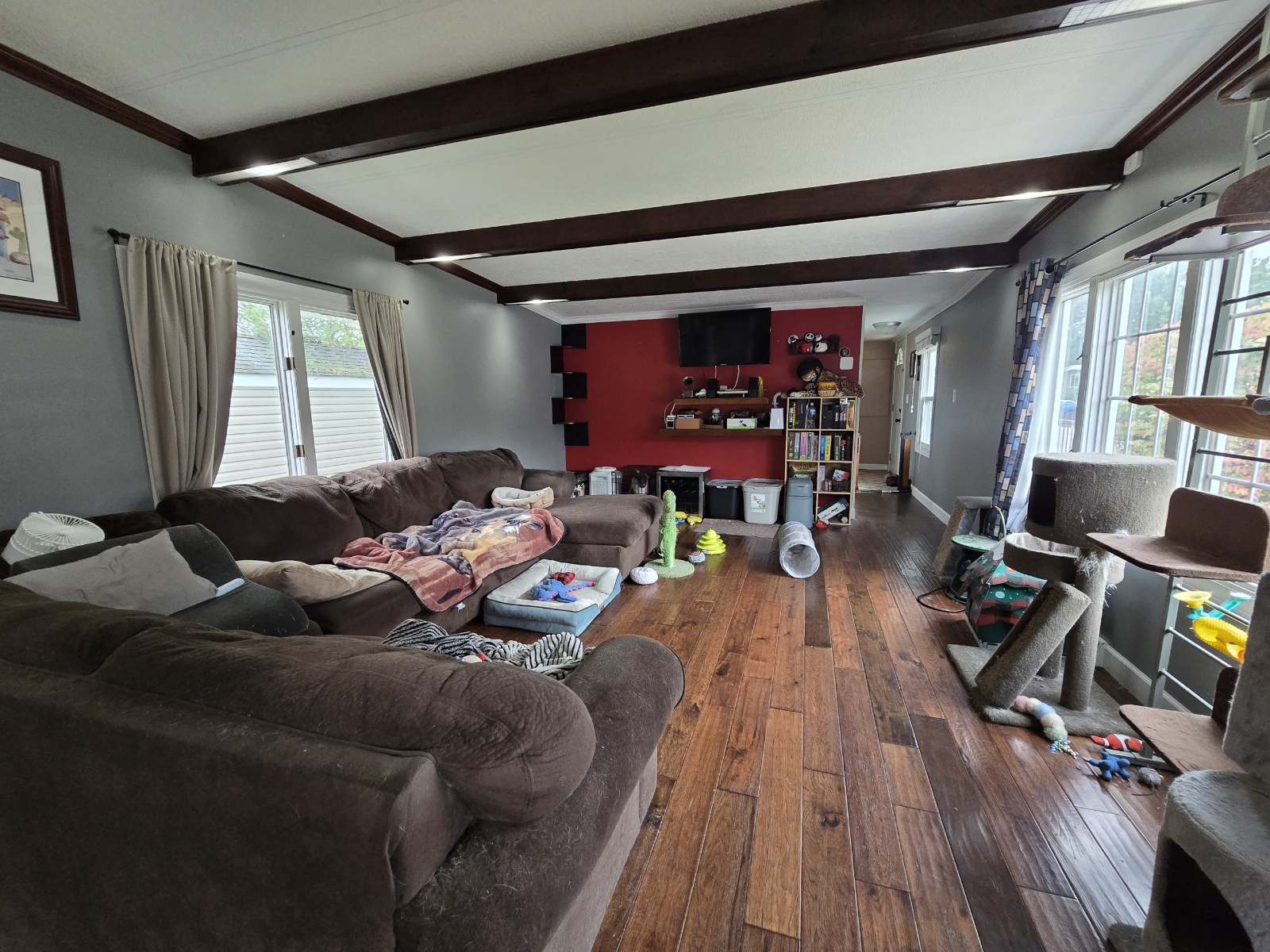 With a new rubber roof, 2 car driveway and 1 car garage, and loaded with updates from top to bottom, this 1980 14×60 2 bedroom 1 bathroom Wick Marshfield manufactured home is ready when you are! The step down front kitchen is wide open with a stove, stainless steel refrigerator, dishwasher, beautiful custom backsplash, pantry, built in desk, and large bow window! The living room is large, has overhead beams with built in lighting and a coat closet. The primary bathroom has been beautifully remodeled and has an absolutely gorgeous double glass door tiled shower! The laundry room is separate, has overhead cabinets, and the washer and dryer are also included! There’s plantation blinds, curtains, a new water heater, central air, a large deck, and the security system can stay if you want it to for $50 per month. Move right in! Pets are welcome too!