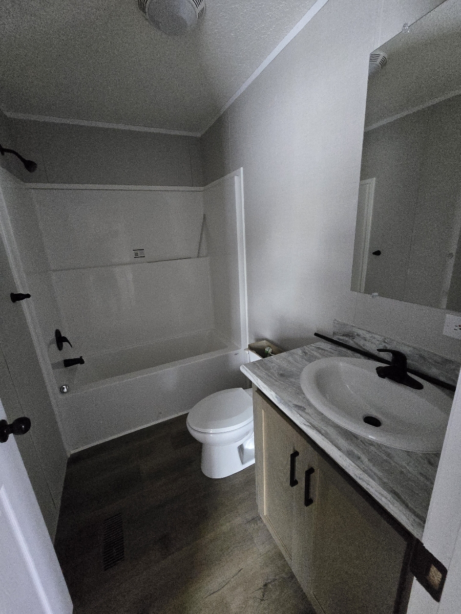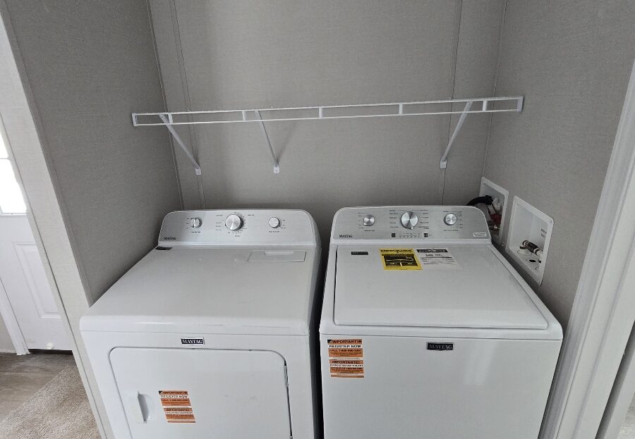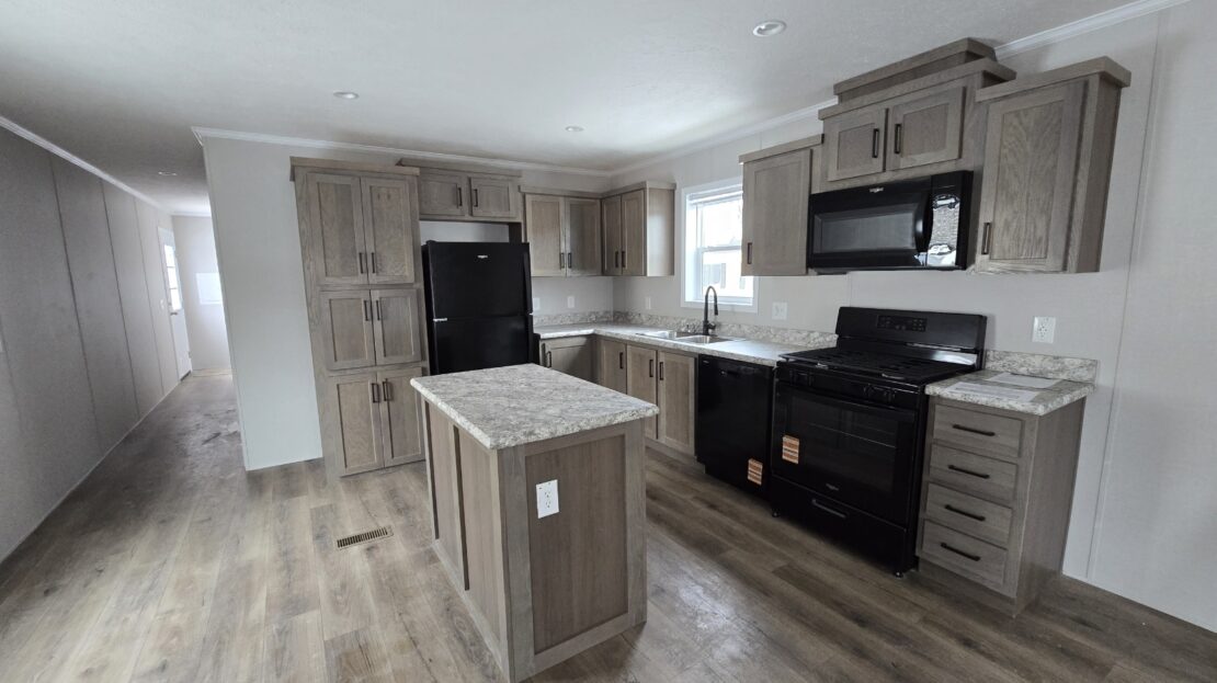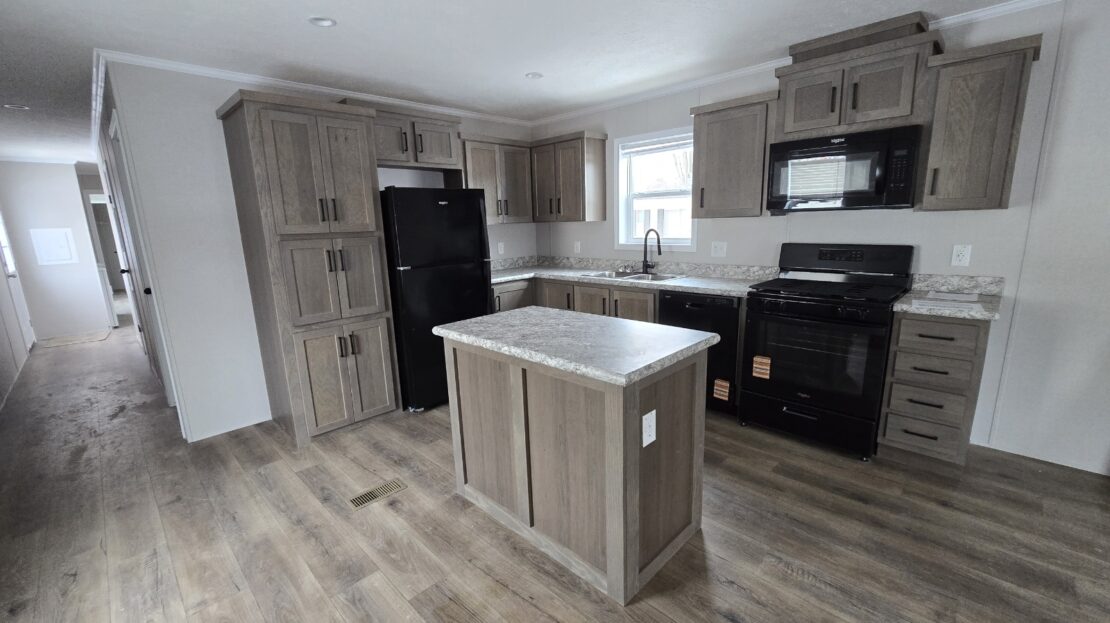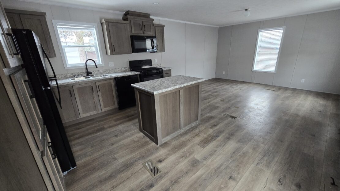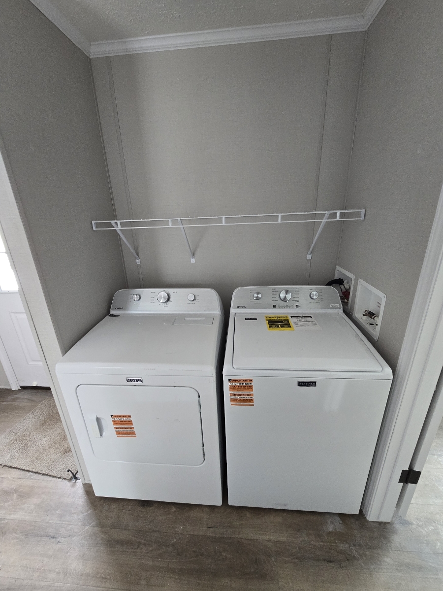 With tall flat ceilings, blinds, and central air, this 2026 16×66 3 bedroom 2 bathroom Champion manufactured home is now available! The kitchen is beautiful with a stove, refrigerator, dishwasher, microwave, tall gooseneck pull down faucet, double door pantry, window over the sink, recessed lighting, and a large island with storage. The primary bedroom is spacious, has a walk in closet, and an attached bathroom. The laundry area is separate, has an overhead shelf, and the washer and dryer are also included! Outside has durable wood steps and a 2 car driveway! Pets are allowed also! Move right in!