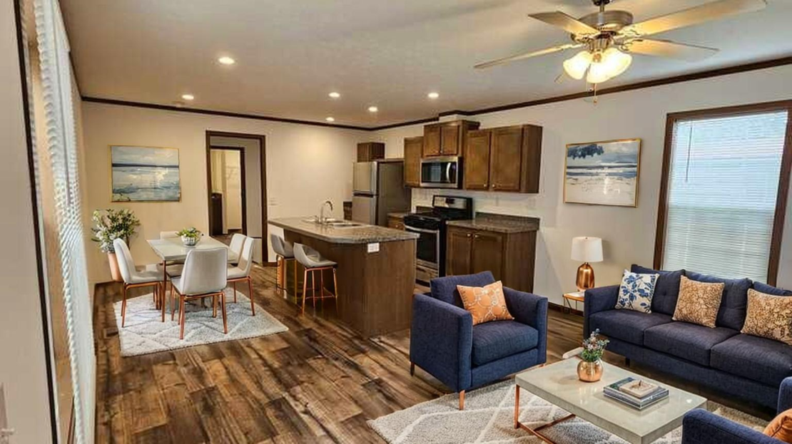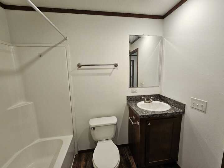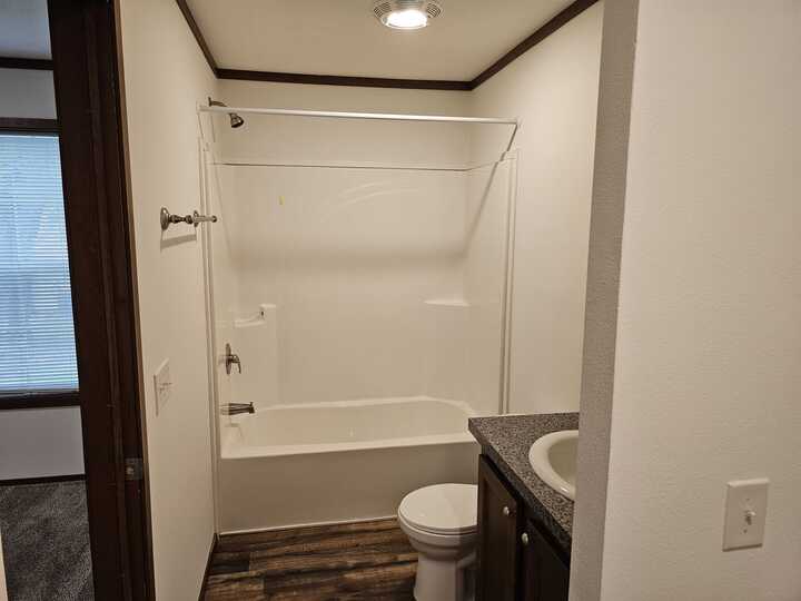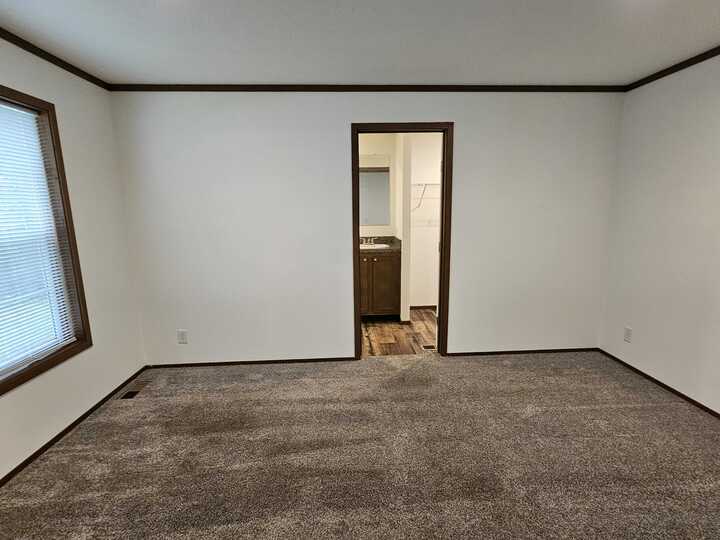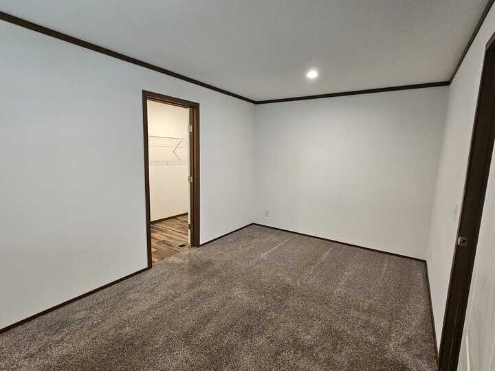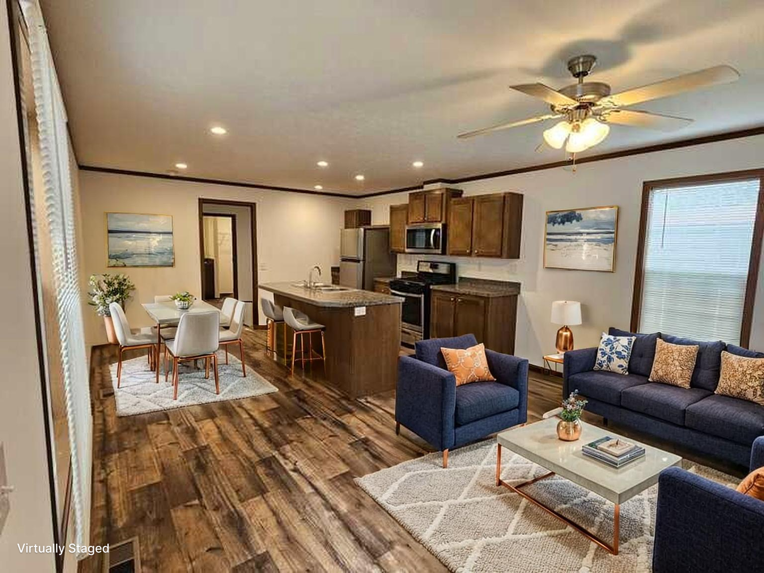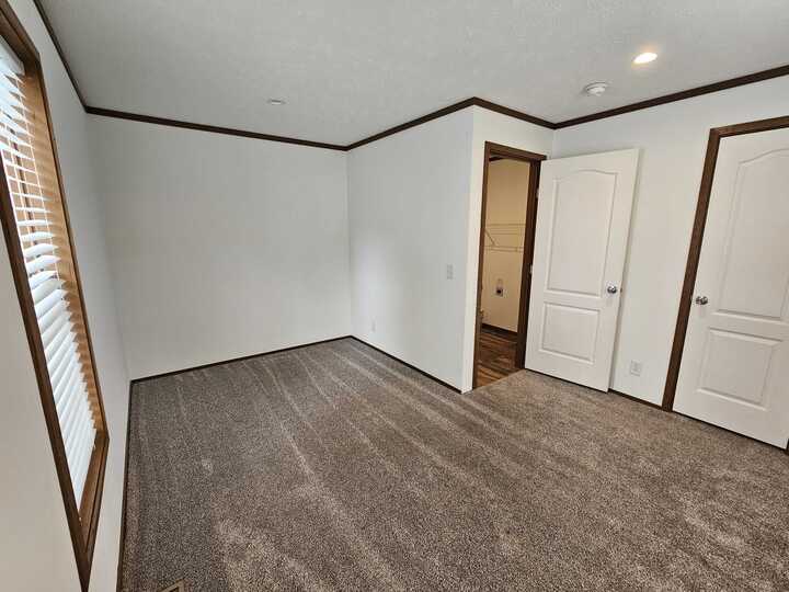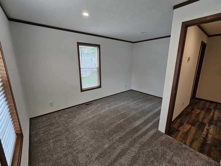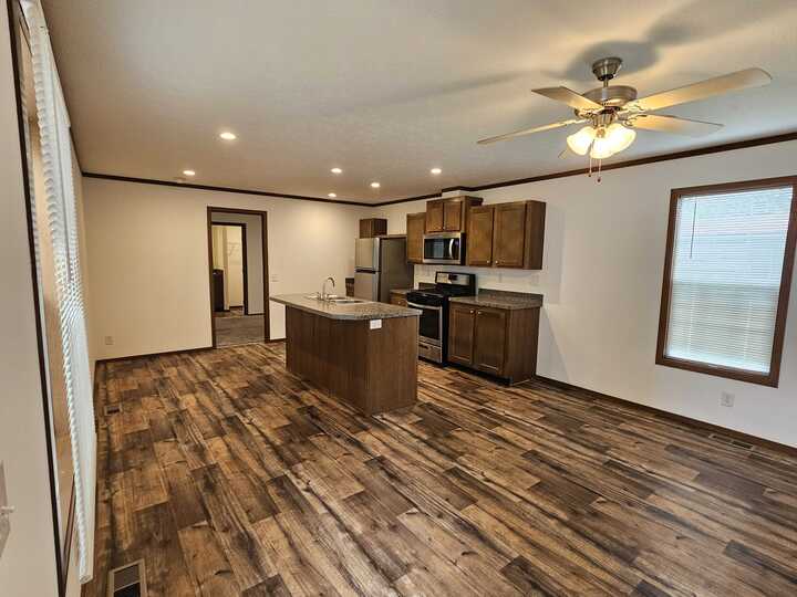 On a treed lot with tall flat ceilings, sheetrock walls, recessed lighting, white paneled doors, and crossbar windows throughout, this 2021 16×60 2 bedroom, 2 bathroom Highland manufactured home is beautiful! The kitchen is large, has a stainless steel stove, refrigerator, dishwasher, and microwave, a kitchen island / breakfast bar, and water filtration. The primary bedroom is spacious, has a large walk in closet and an attached bathroom! There are also blinds, central air, a lighted ceiling fan, and a washer and dryer. Move right in! Pets are welcome too!