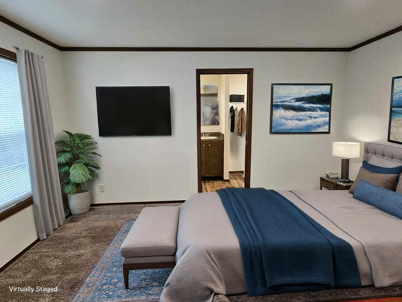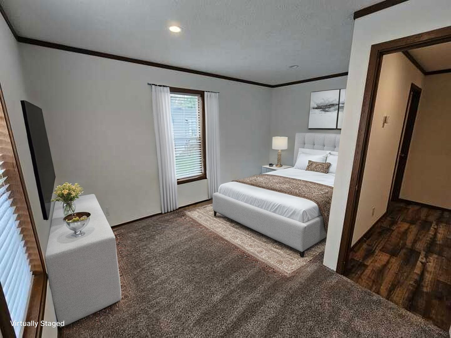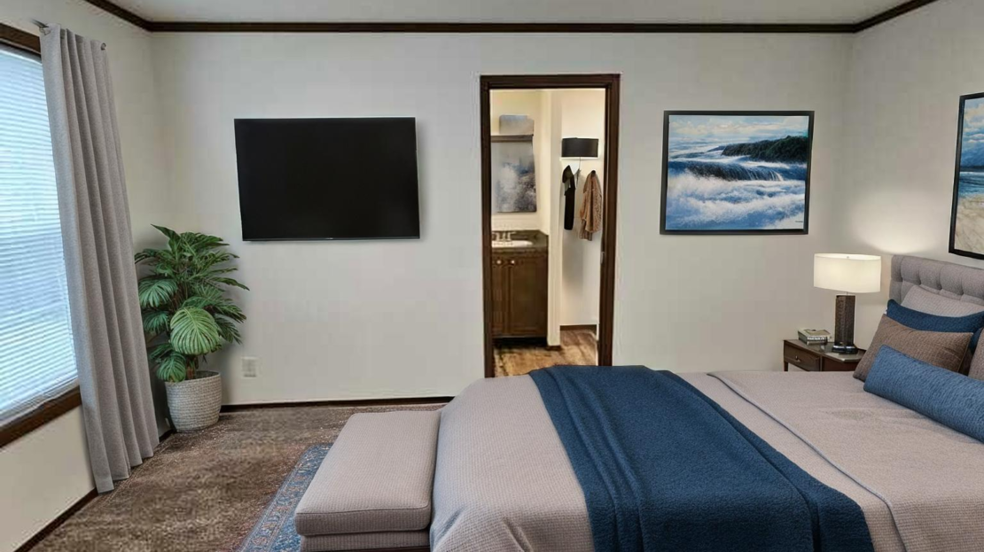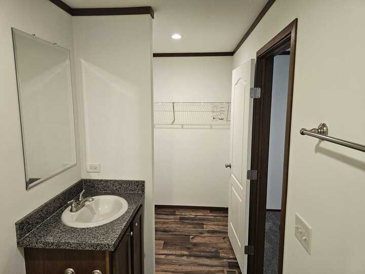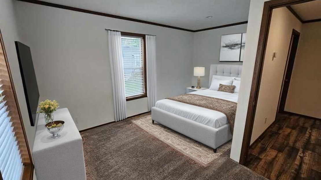 On a treed lot with tall flat ceilings, sheetrock walls, recessed lighting, white paneled doors, and crossbar windows throughout, this 2021 16×60 2 bedroom, 2 bathroom Highland manufactured home is beautiful! The kitchen is large, has a stainless steel stove, refrigerator, dishwasher, and microwave, a kitchen island / breakfast bar, and water filtration. The primary bedroom is spacious, has a large walk in closet and an attached bathroom! There are also blinds, central air, a lighted ceiling fan, and a washer and dryer. Move right in! Pets are welcome too!