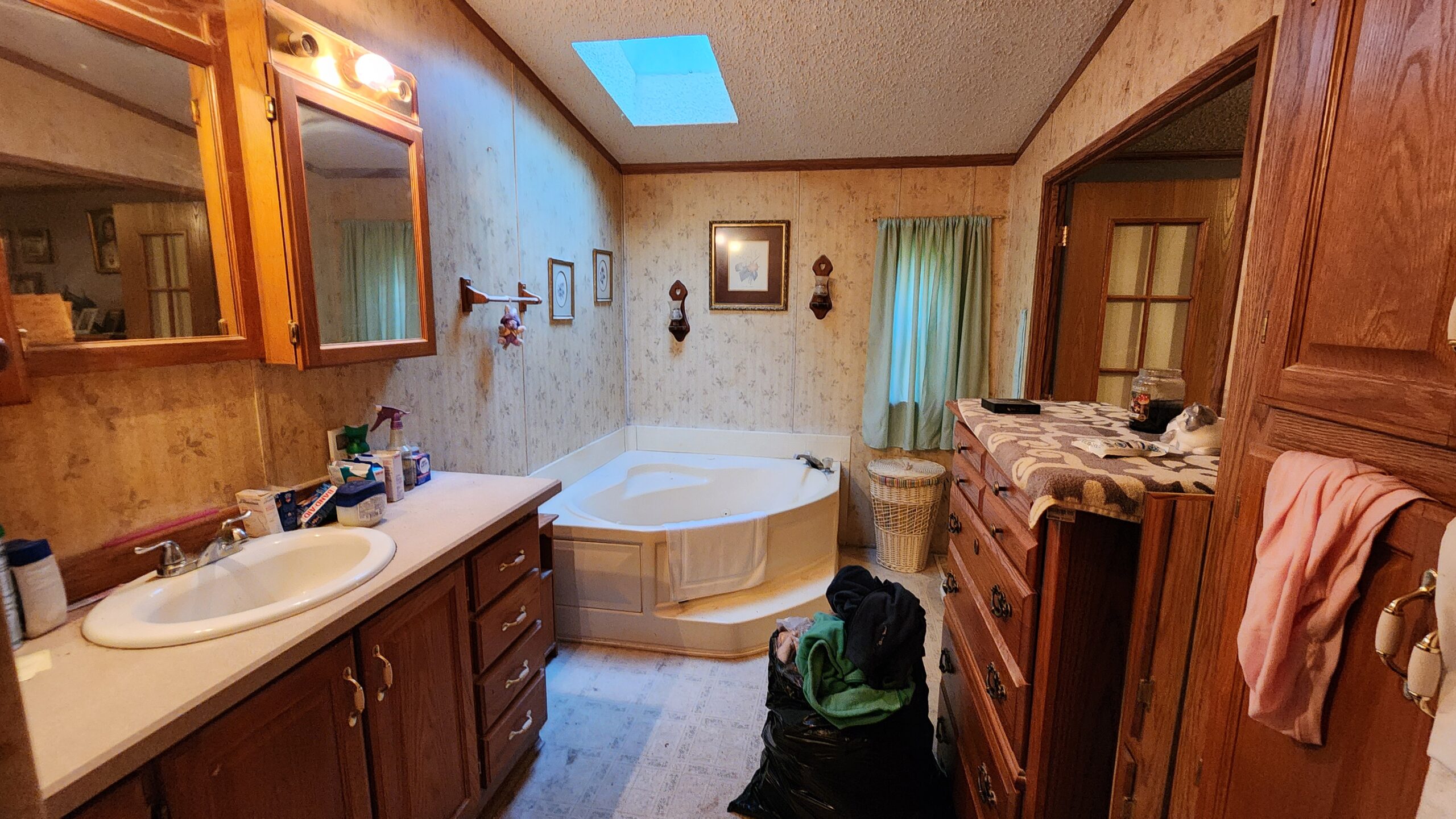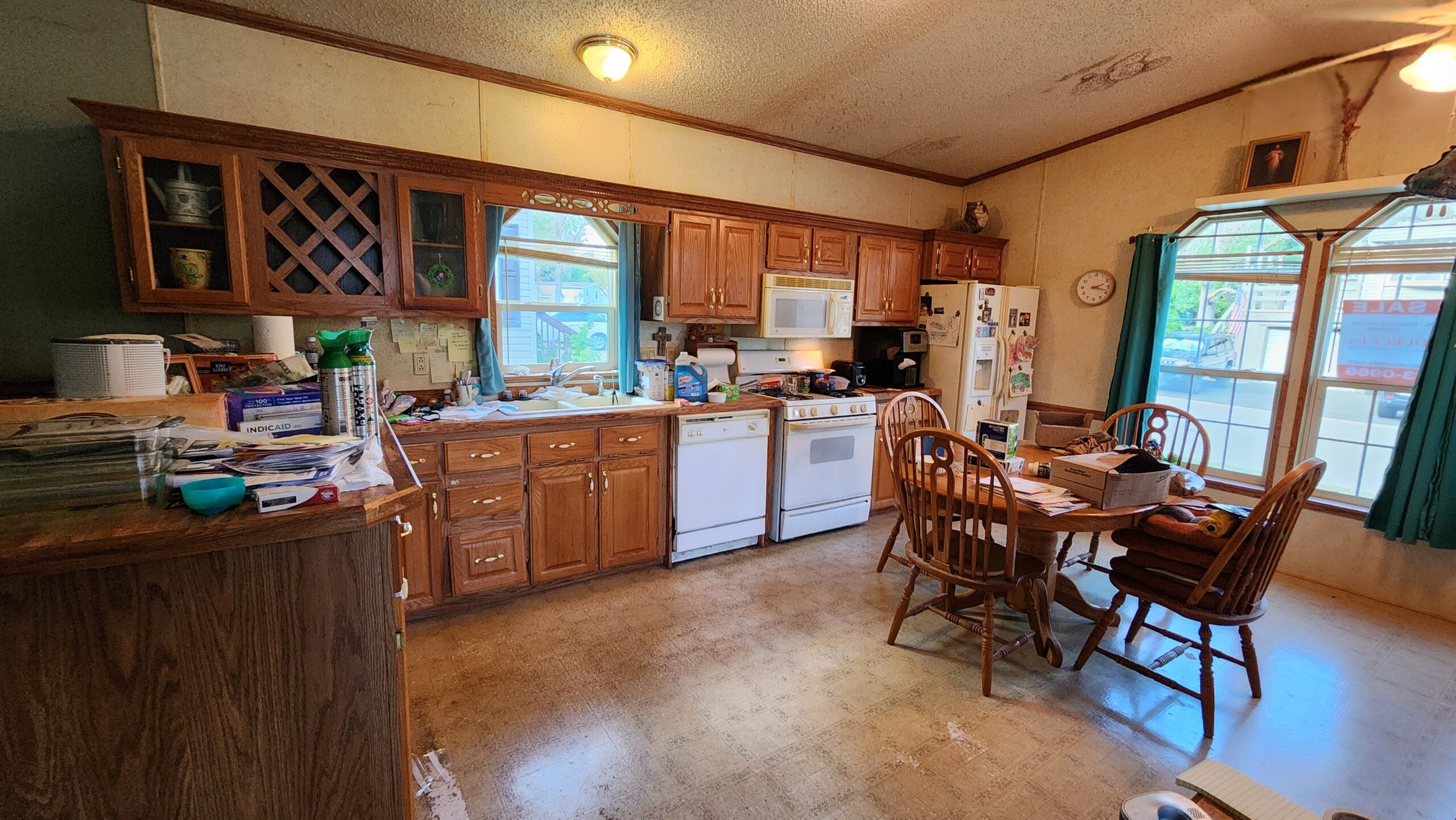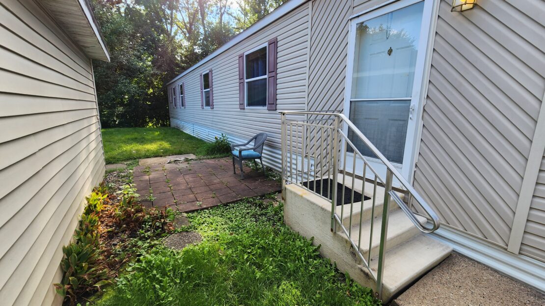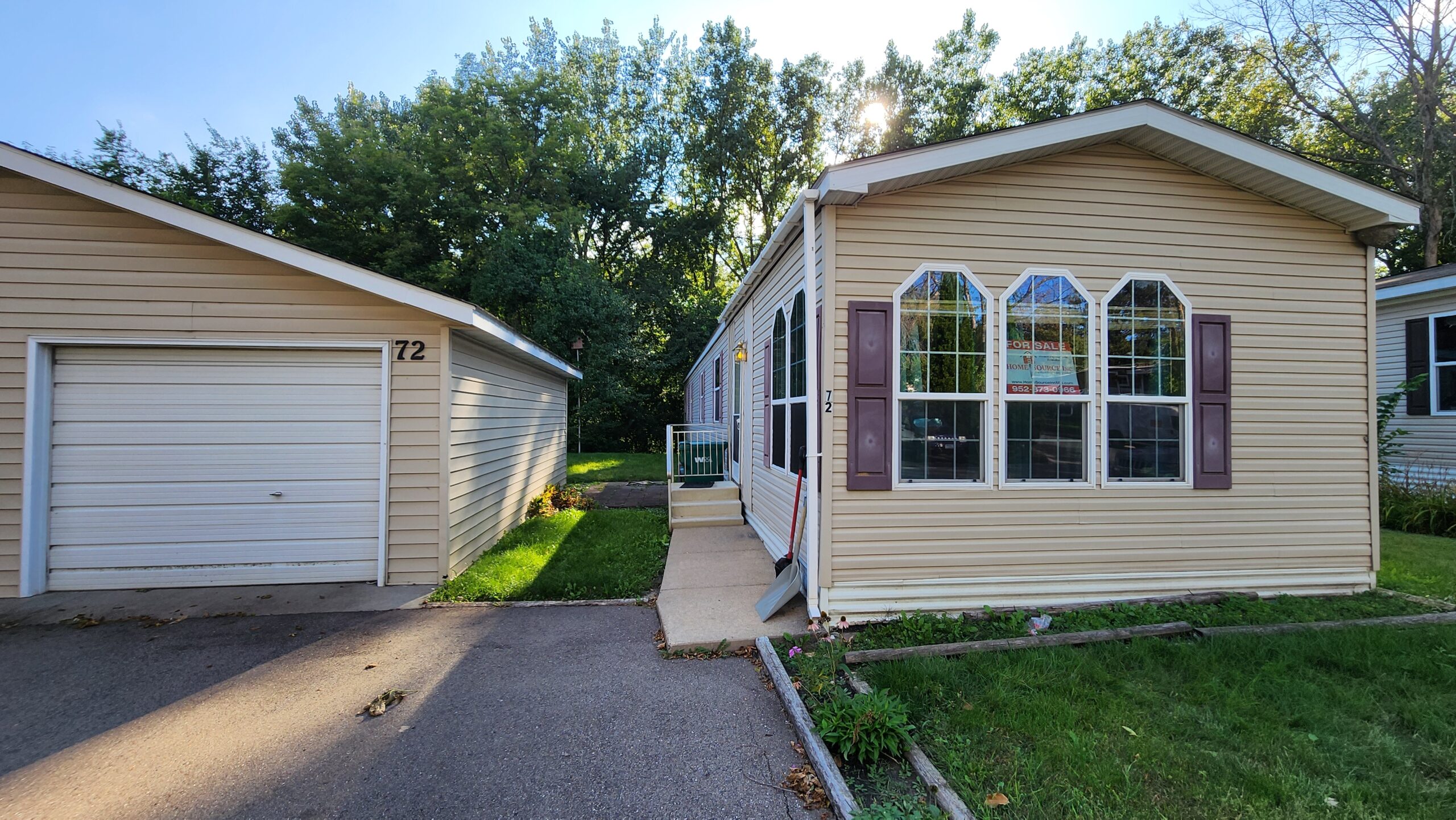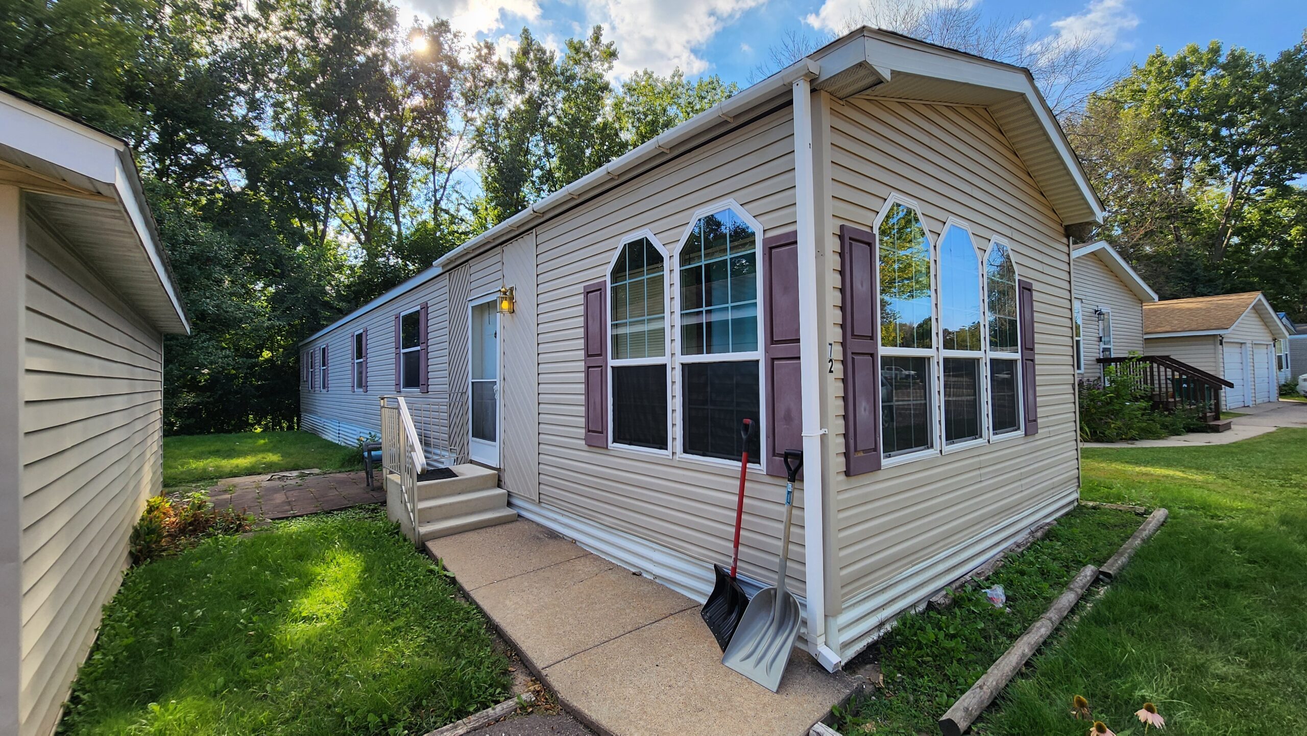 The first one to contact us will be able to move right into this 2002 16×76 2 bedroom 2 bathroom Friendship Northern Classic absolutely loaded with a large front eat in kitchen with a stove, side by side refrigerator, dishwasher, microwave, pantry, moveable kitchen island, deep double sink, and even a built in wine rack, and loaded with windows! Step up to the large living room with a cathedral ceiling, a lighted ceiling fan and coat closet. The primary suite is ENORMOUS with a large walk in closet, lighted ceiling fan, and French doors leading to a huge bathroom with a corner whirlpool bathtub, dual medicine cabinets, a linen cabinet, a walk in shower, and enough extra room for the large dresser that’s in the pictures! There are also French doors leading to the second bedroom. The laundry room is separate, has overhead shelving and cabinetry, and the washer and dryer are also included. It’s loaded with skylights, 6 panel doors, built ins galore, central air, a newer water heater, water softener, and blinds and curtains! The seller has home service plus, so it has been very well taken care of. The outside lot is great with no neighbors behind making the patio area very private. There’s also a 2 car driveway AND a garage! They are looking for a quick sale, which shows in the pricing. The pictures are a little bit rough, but whatever you want can stay in the home also if you would like, otherwise, it will be removed.  Pets are welcome too!